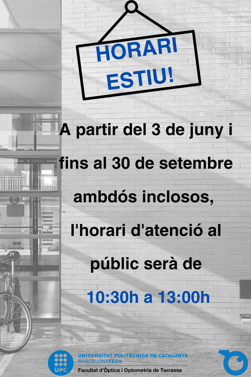 HORARI ESTIU GESTIÓ ACADÈMICADel 3 de juny i fins el 30 de setembre de 2025 l'horari d'atenció al públic serà de 10:30h a 13:00h.https://foot.upc.edu/ca/noticies/28-5-horari-gestio-academicahttps://foot.upc.edu/ca/noticies/28-5-horari-gestio-academica/@@download/image/CAT HORARI ESTIU.png