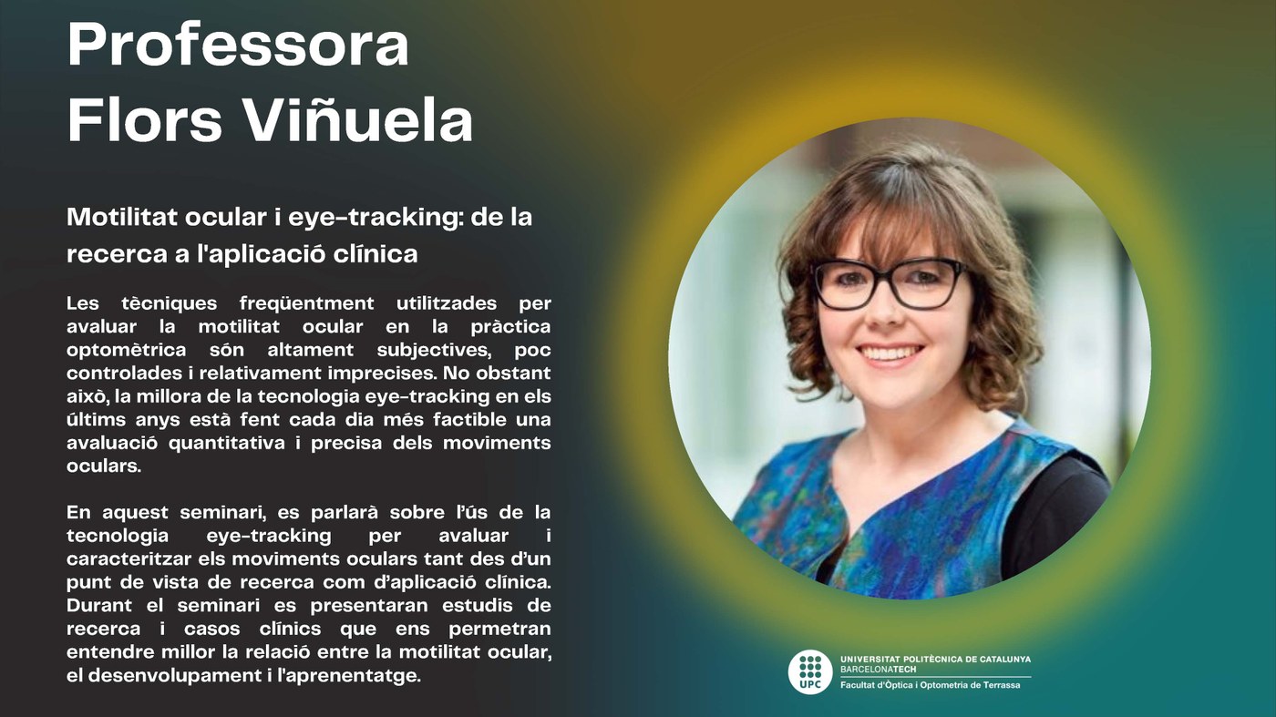 En aquest seminari, es parlarà sobre l’ús de la tecnologia eye-tracking per avaluar i caracteritzar els moviments oculars tant des d’un punt de vista de recerca com d’aplicació clínica. Durant el seminari es presentaran estudis de recerca i casos clínics que ens permetran entendre millor la relació entre la motilitat ocular, el desenvolupament i l'aprenentatge.