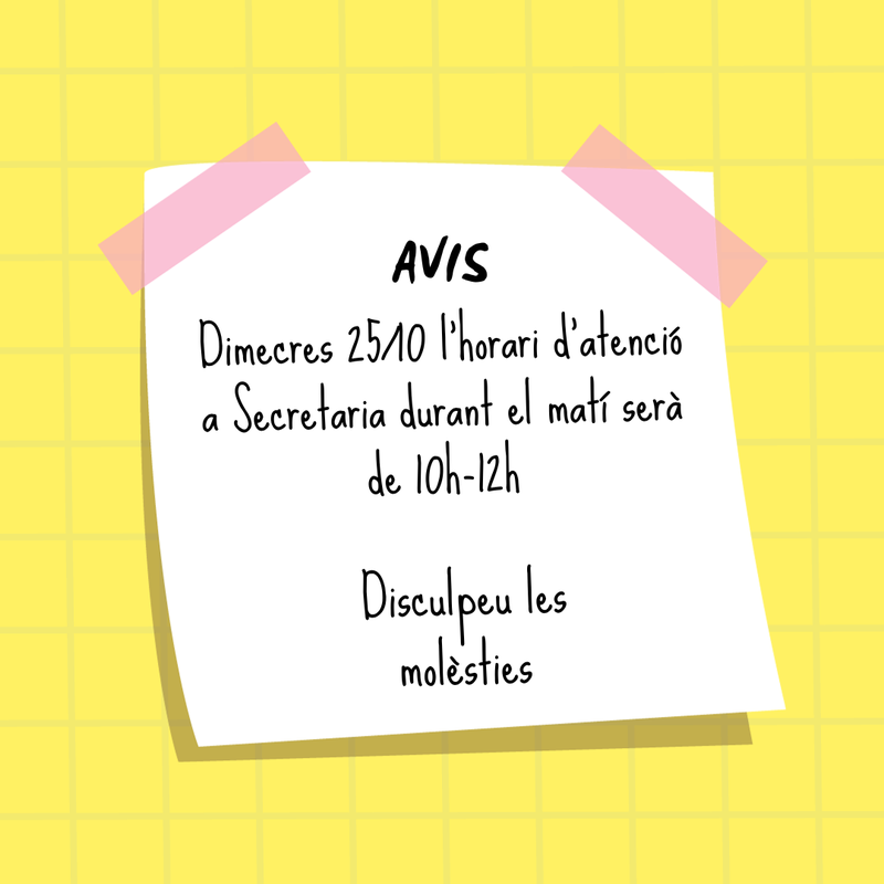 Us informem que demà dimecres 25/10 l'horari d'atenció a Secretaria durant el matí serà de 10h-12h