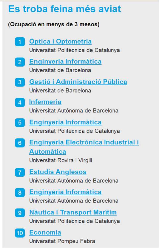 Segons el portal educatiu UNPORTAL, el Grau en Òptica i Optometria de la Universitat Politècnica de Catalunya es situa en la primera posició dels Graus on els estudiants troben feina més aviat, amb una taxa d’ocupació del 96.4%.