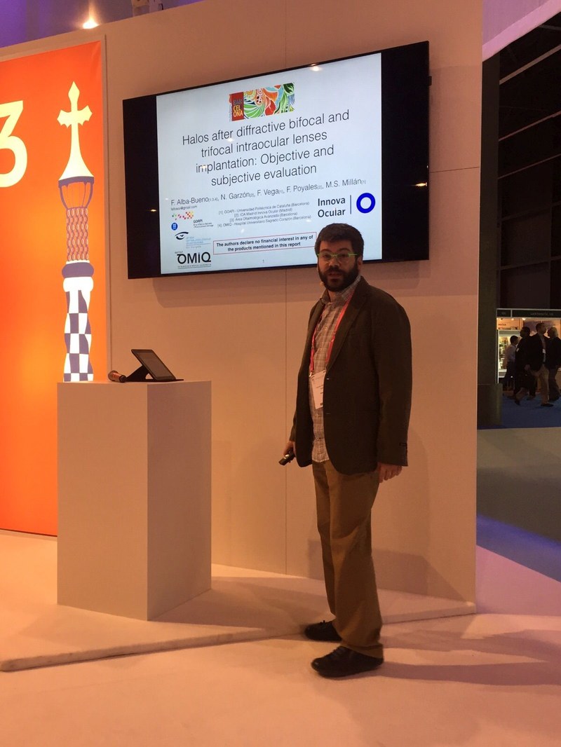 El Dr. Francisco Alba Bueno (DOO, PhD), ex-estudiant de la FOOT i membre del Grup d'Òptica Aplicada y Procesado de Imagen (GOAPI), ha rebut el premi al millor pòster en la categoria de cataractes que porta per títol "Halos after diffractive bifocal and trifocal intraocular lenses implantation: objective and subjective evaluation", en el Congrés de la Societat Europea de Cataractes i Cirugia Refractiva celebrat del 5 al 9 de setembre a Barcelona (ESCRS).