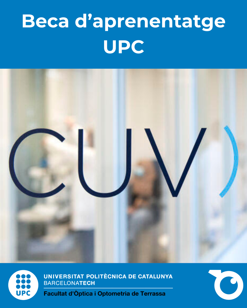 S’ha iniciat la convocatòria de la Beca d’Aprenentatge UPC per formar part de l’equip del Centre Universitari de la Visió (CUV) durant el curs 2025-2026. Aquesta beca ofereix l’oportunitat d’adquirir experiència pràctica en tasques de gestió, atenció a pacients i suport tècnic en un entorn assistencial vinculat a l'Òptica i l'Optometria.