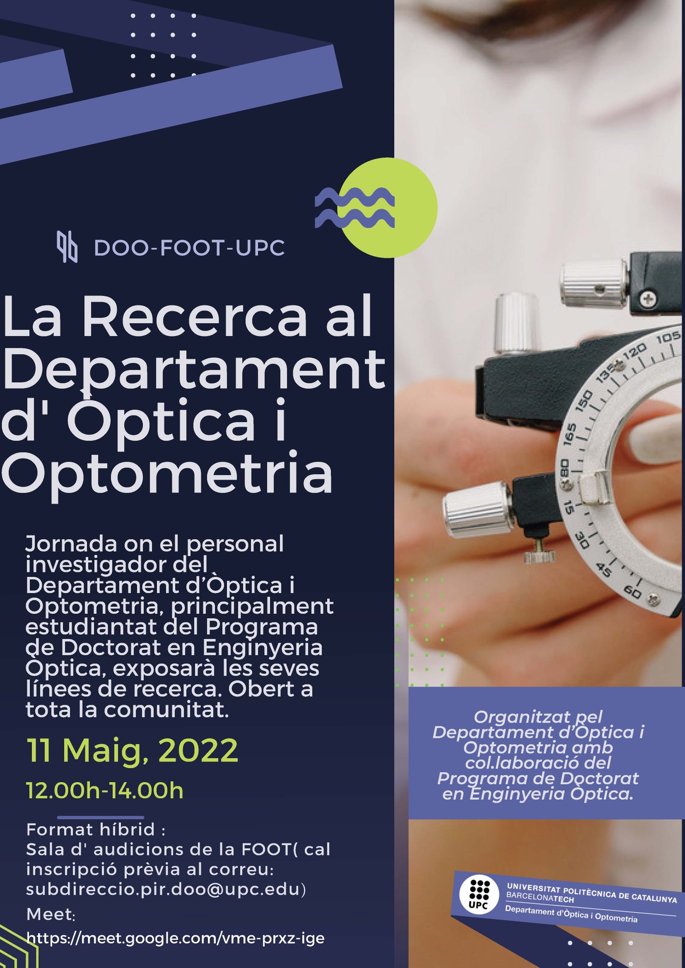 El Departamento de Óptica y Optometría junto con el Programa de Doctorado en Ingeniería Óptica ha organizado una jornada de investigación con el objetivo de exponer la investigación que se realiza en el departamento, con un interés especial en que el alumnado de doctorado haga una presentación de su labor, conozcan otros compañeros y se facilite la colaboración entre ellos. Las presentaciones serán de unos 10 minutos, muy ágiles, en un formato similar a los de las charlas en un congreso. Esta jornada será el 11 de mayo de 12:00 a 14:00. Al finalizar la jornada habrá un pequeño picoteo para comentar las charlas.